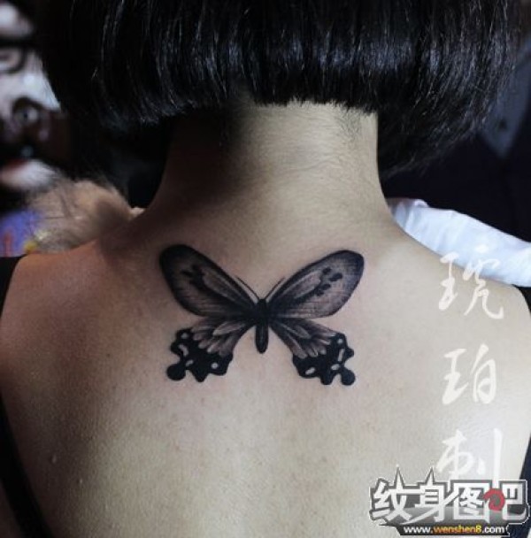 女生后腰纹身黑白灰风格抽象线条纹身图案