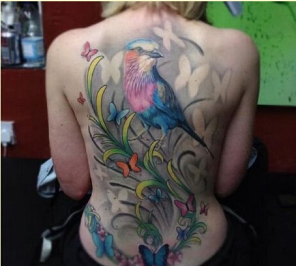 女生背部时尚好看的小鸟纹身