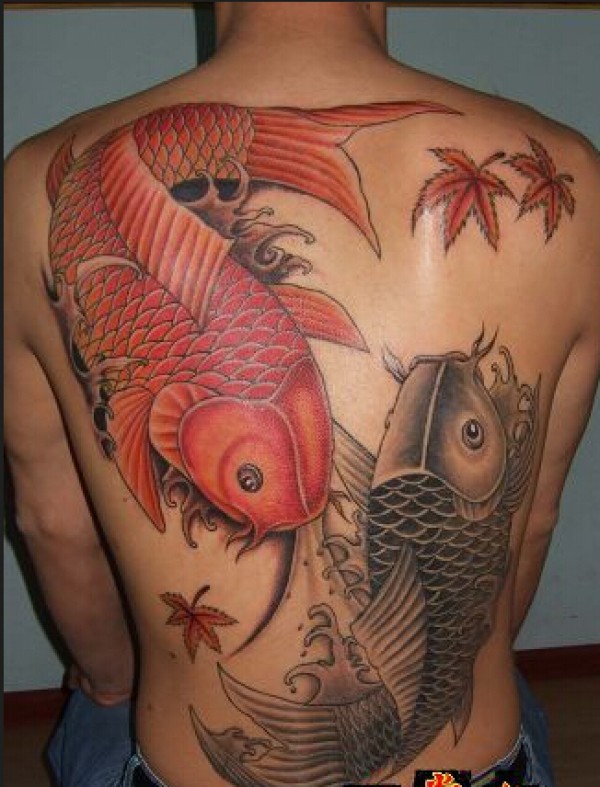 个性男士后背时尚好看的两条鲤鱼纹身图片