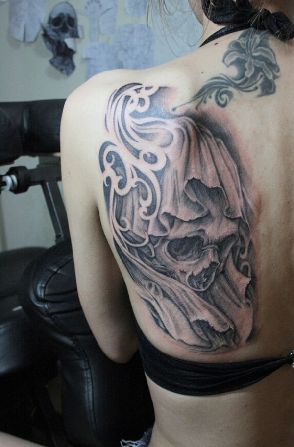 女生背部个性时尚的骷髅纹身
