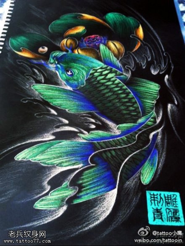 彩色鲤鱼莲花纹身手稿图片