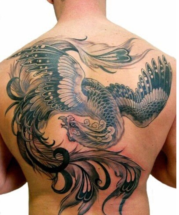 男人后背时尚经典好看的黑灰凤凰纹身图片