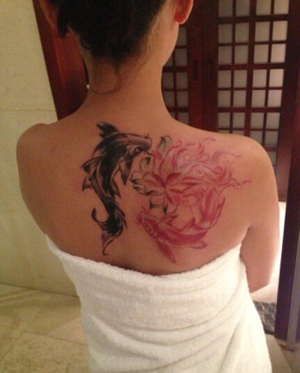 美女后背漂亮好看的莲花鲤鱼纹身图案