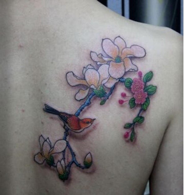 女孩子背部精美好看的喜鹊梅花纹身图图片