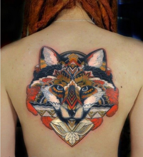 时尚女生背部唯美好看的彩色狐狸纹身图片