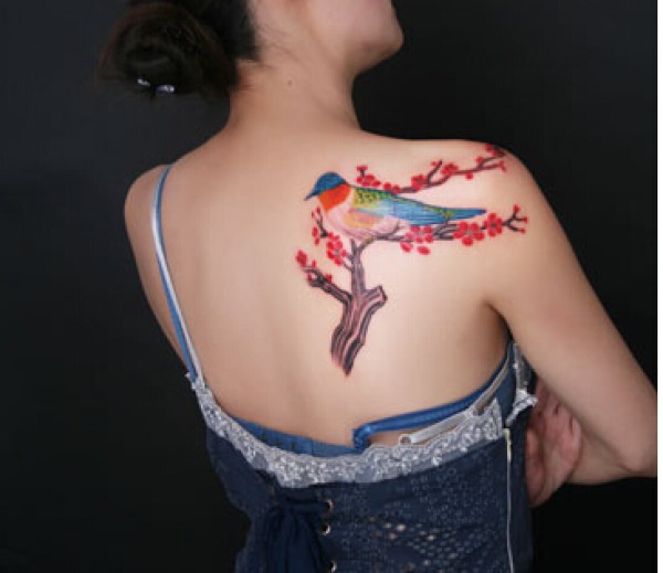 时尚女生后背时尚好看的梅花鸟纹身图图片