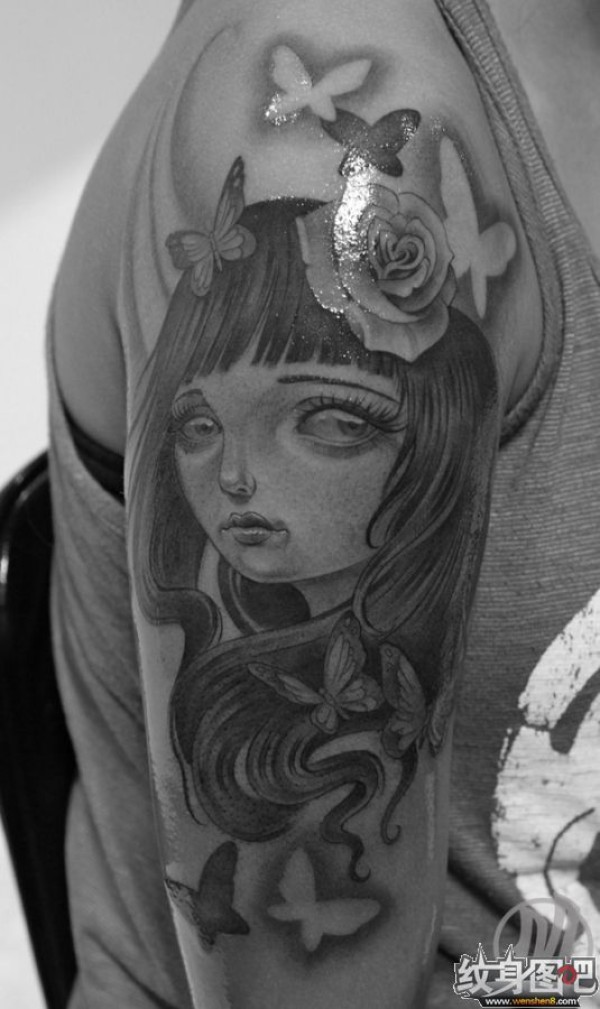 男人大臂黑白彼岸花骷髅_黑白纹身图案大全_纹身图吧