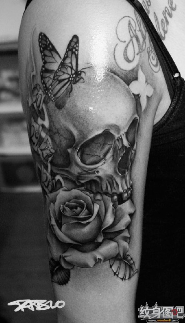 男人大臂黑白彼岸花骷髅_黑白纹身图案大全_纹身图吧