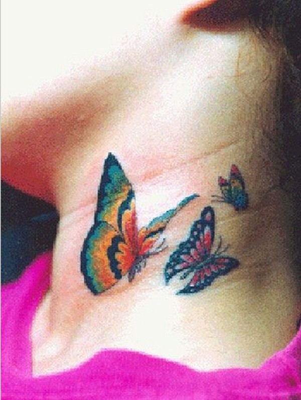 脖子上三只漂亮好看的彩色蝴蝶纹身图图片