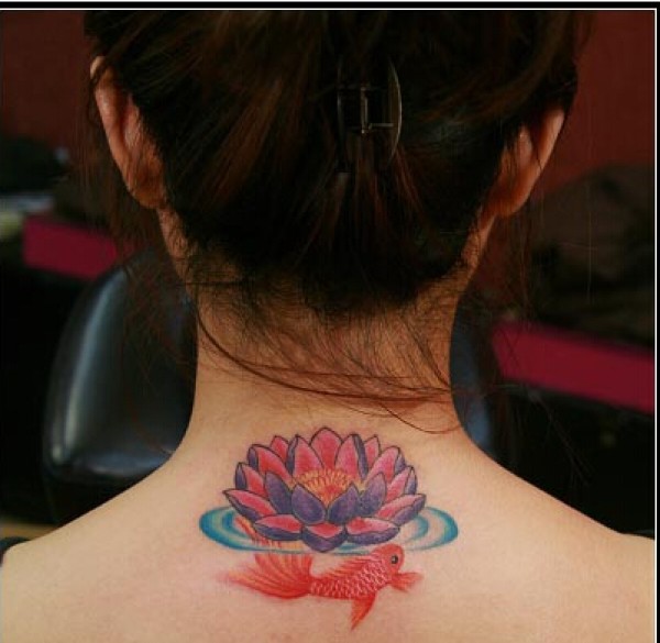 时尚女生颈部漂亮好看的莲花锦鲤纹身图片