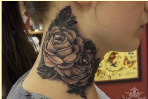时尚女生脖子处好看的黑白玫瑰花纹身图片
