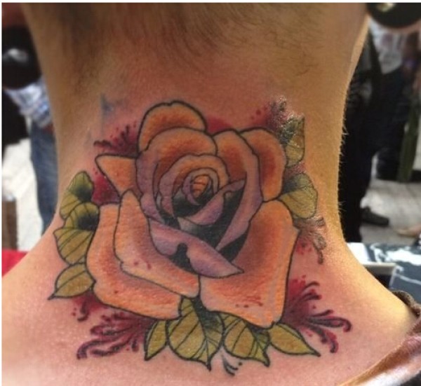 男生后脖子处精美漂亮的玫瑰花纹身图图片
