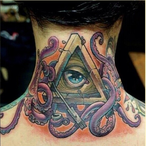 脖子上个性十足的彩色骷髅纹身_脖子纹身图案大全_纹身图吧