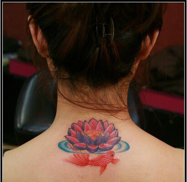 美女颈部唯美好看的莲花锦鲤纹身图案