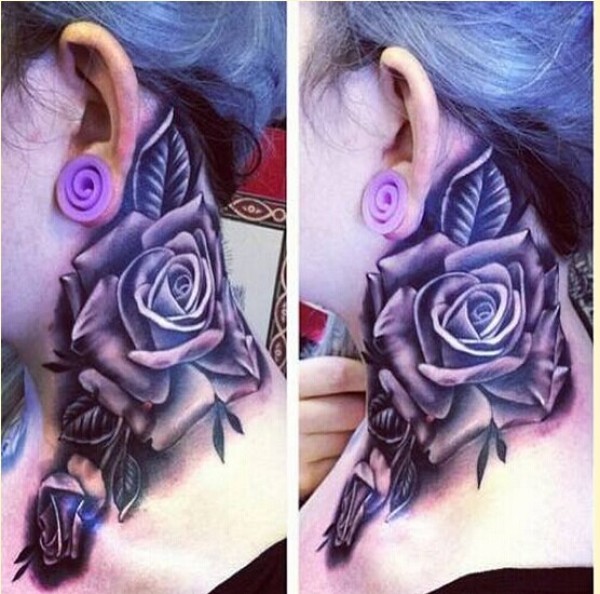 个性脖子漂亮彩色玫瑰花纹身