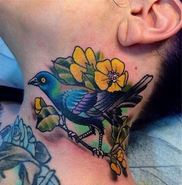 男人脖子彩色燕子刺青图案图片_脖子纹身图案大全_纹身图吧