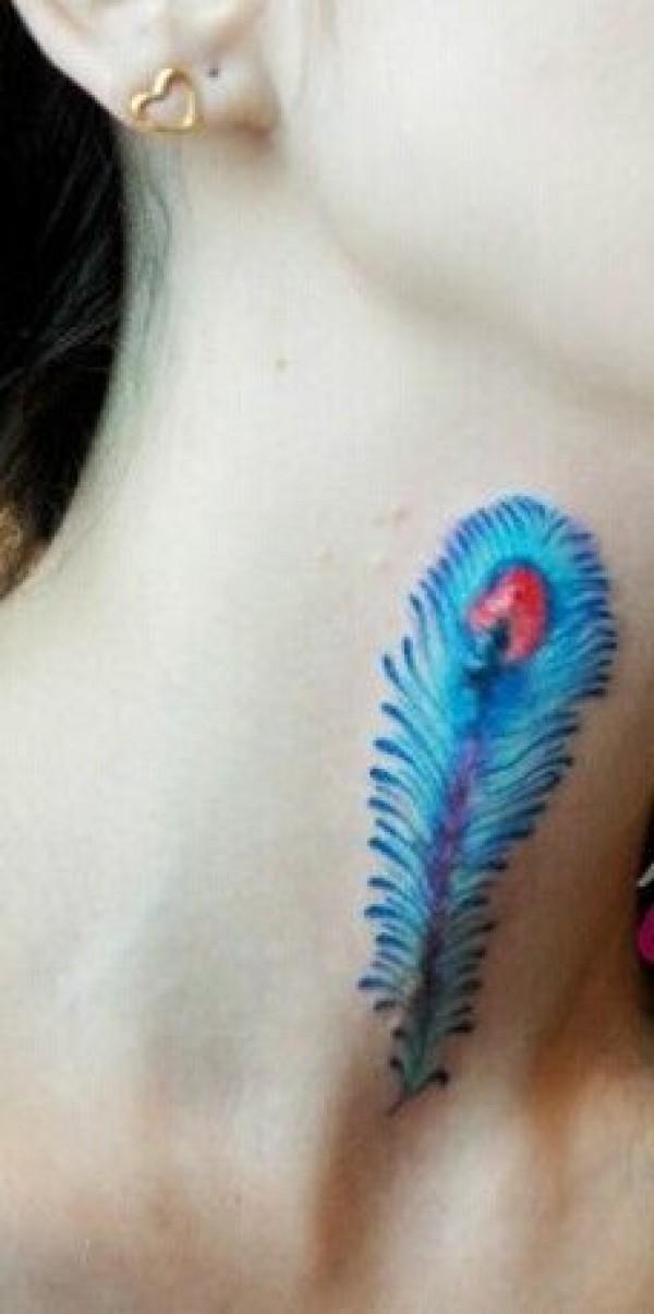 美女遮疤蓝色羽毛脖子部位纹身图片