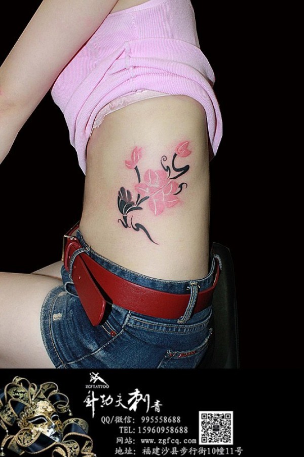 女生侧腰花纹身