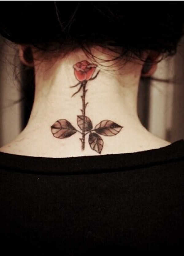 女生脖子优雅的带刺红玫瑰纹身图图片