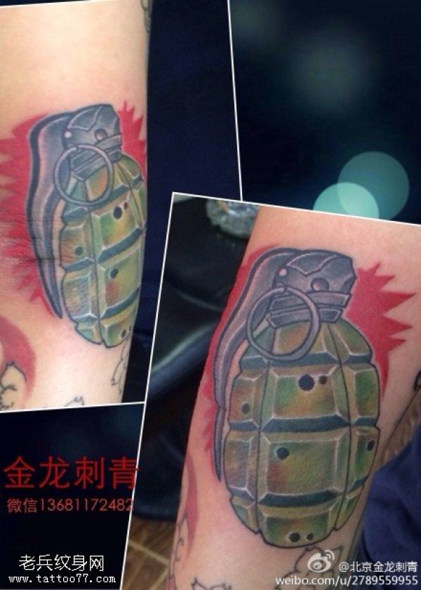 胳膊超写实绿色手雷纹身图案