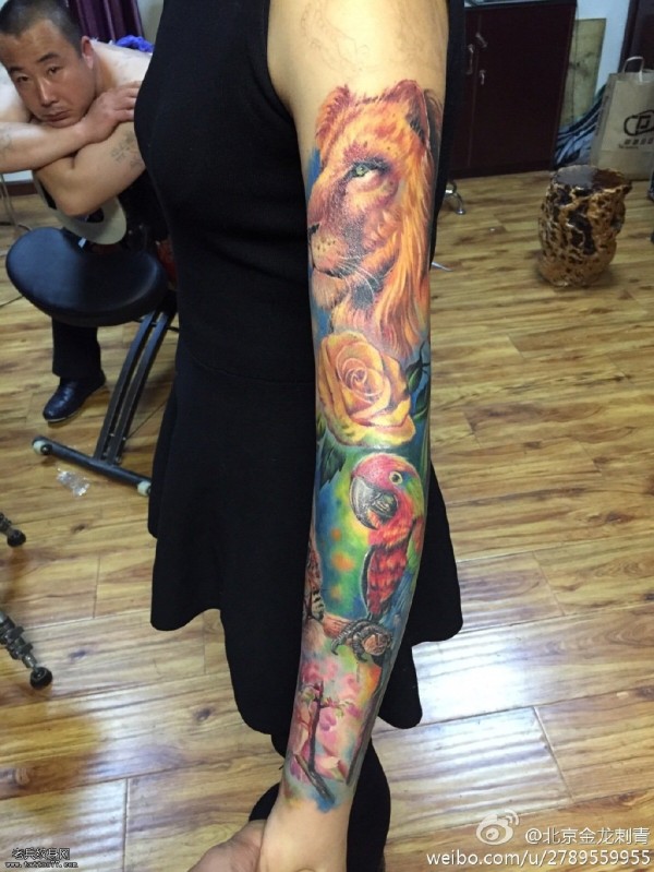 胳膊金黄色狮子翠绿色鹦鹉纹身图案
