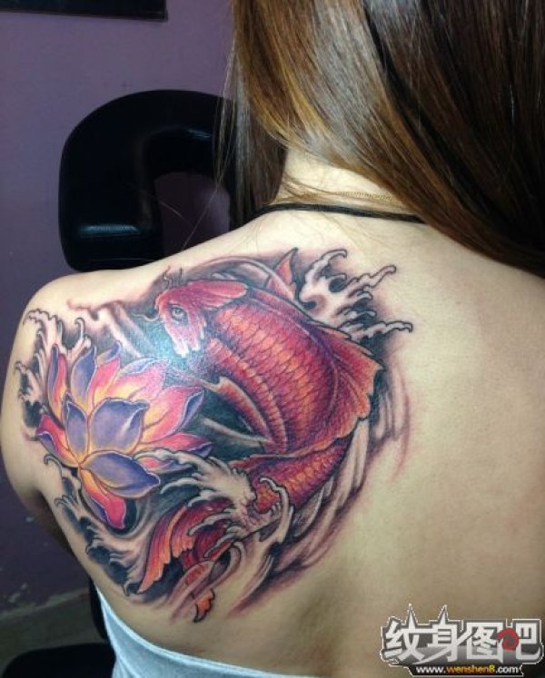 美女后背的鲤鱼莲花