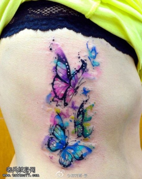 女生侧腰彩色泼墨蝴蝶纹身图案