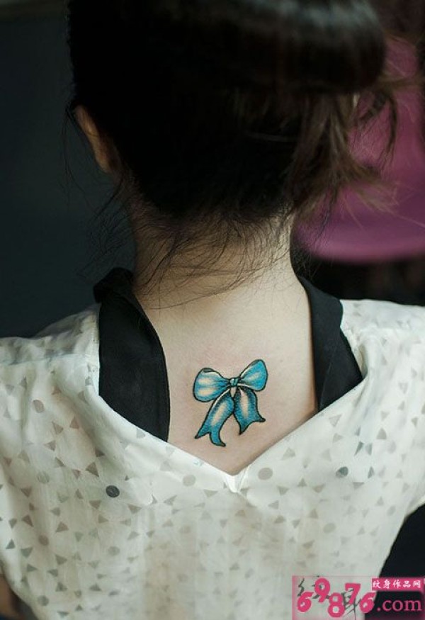 蓝色蝴蝶结后颈纹身图片