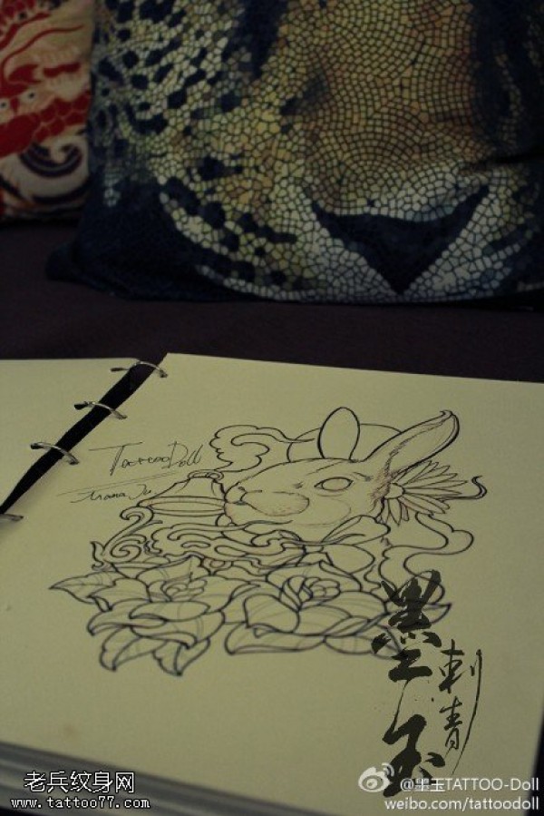 卡通兔子玫瑰纹身手稿图案