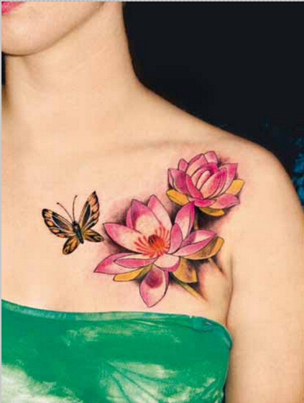 性感女生胸前漂亮好看的蝴蝶纹身荷花图片