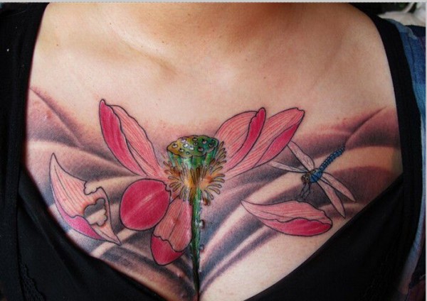 性感女生胸前时尚好看的荷花纹身