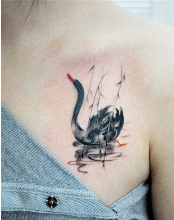 女生胸口唯美好看的水墨风格鹅纹身图图片