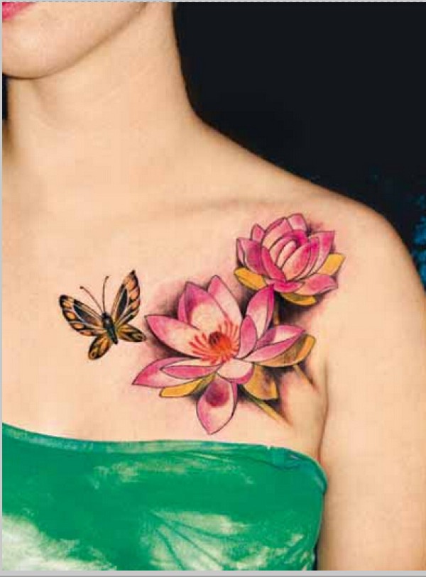 美女胸前漂亮好看的蝴蝶和荷花纹身图图片