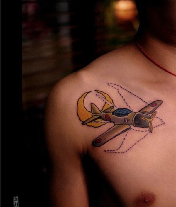 男士胸口彩色个性时尚好看的飞机纹身图片
