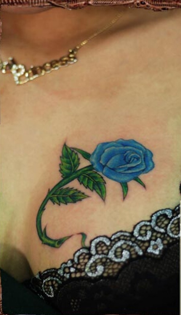 巨乳美女胸口上的性感玫瑰纹身图案