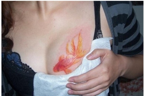 性感美女胸部小巧漂亮好看的金鱼纹身图片