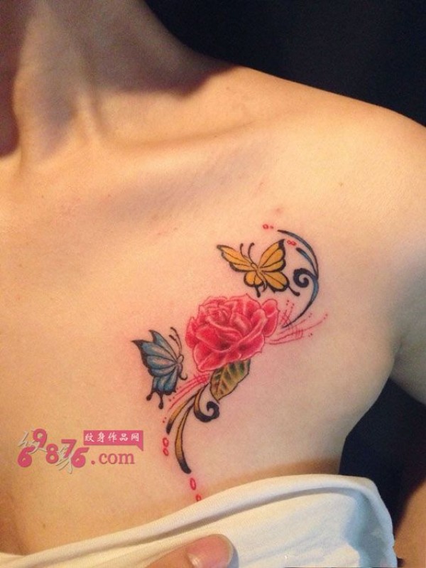 个性女生胸部血玫瑰蝴蝶纹身图案