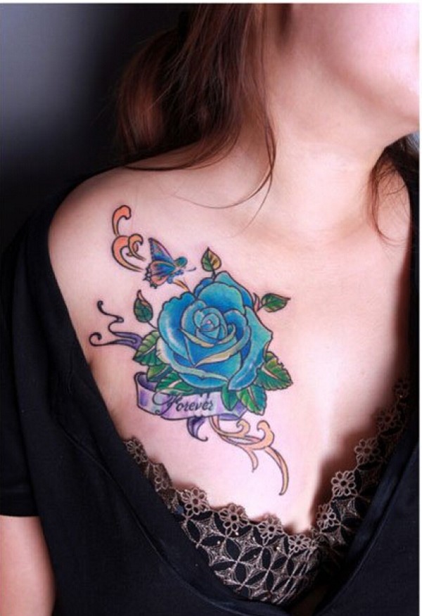 女生前胸时尚好看的的彩色玫瑰花纹身图片