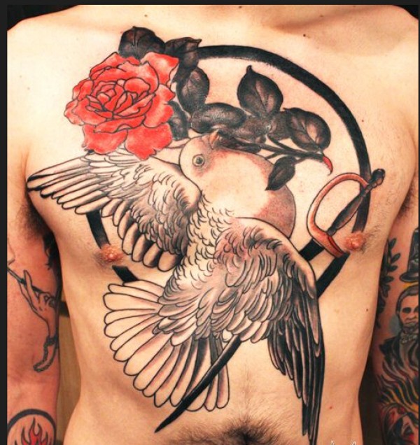 个性男士胸前白色的鸽子和玫瑰纹身图图片