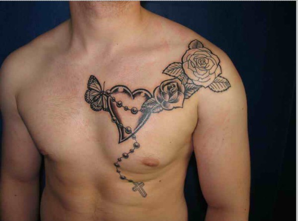胸部心形十字架玫瑰纹身图片图片