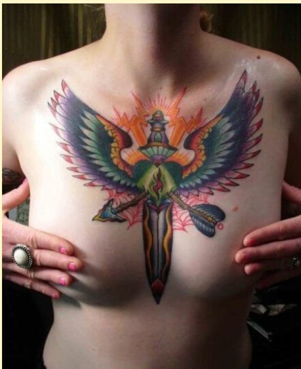 时尚经典女生胸部漂亮匕首翅膀纹身图图片