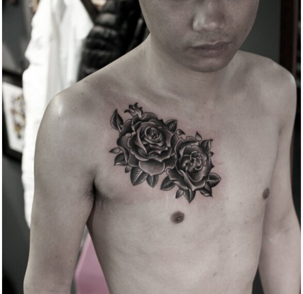 个性时尚男士前胸漂亮的玫瑰花纹身图图片