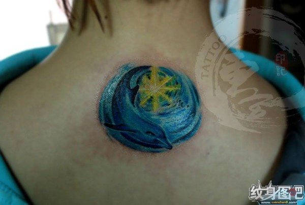脖子后面蓝色的海豚纹身图案
