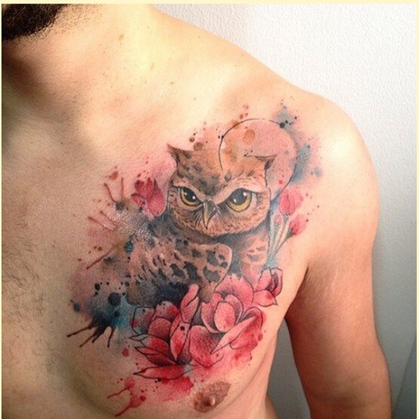 个性男士胸口时尚彩色猫头鹰纹身图片图片