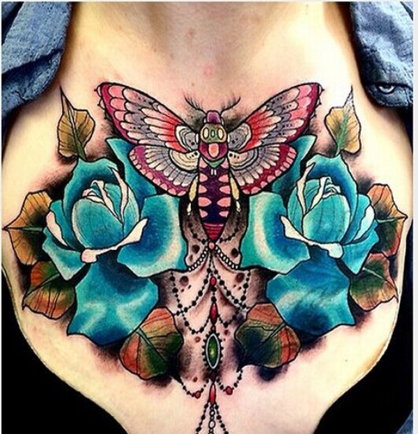 性感女生胸口玫瑰花蛾子纹身图案欣赏图片