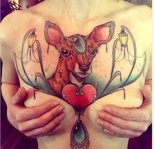 性感女生胸部彩色鹿纹身图案欣赏图片