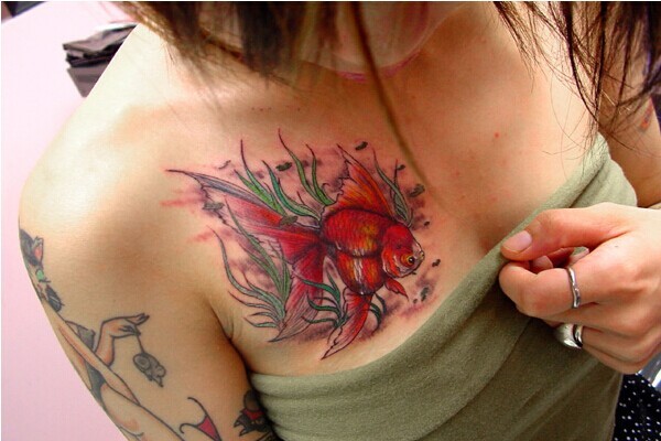 漂亮女生胸部精美性感的金鱼戏水纹身图片