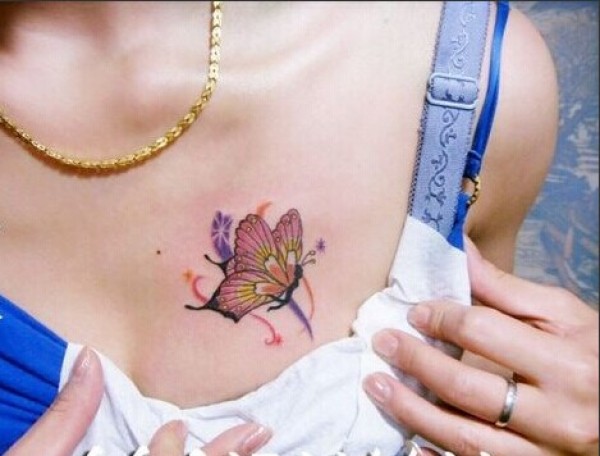 漂亮女生胸部精美性感的花蝴蝶纹身图图片