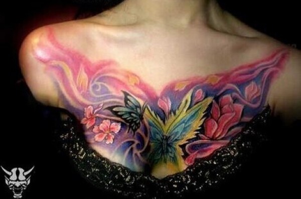 女生胸部彩色漂亮大小蝴蝶图腾纹身图片