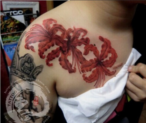 性感女生胸部漂亮精美的彼岸花纹身图图片